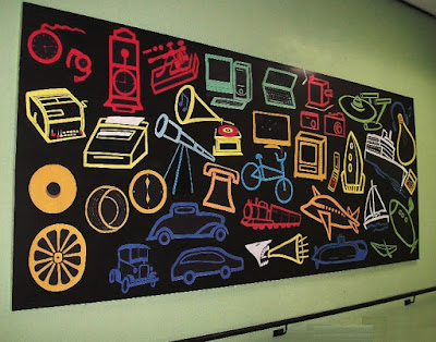 Pesquisando para criar esse painel, descobri informações muito interessantes e peculiares sobre vários inventos. Porém quero ressalvar o invento que na minha opinião possibilitou, acelerou e evoluiu a sociedade até os dias de hoje e continua sendo utilizada na sua forma primária, com algumas variações, a mais de 5000 anos, que é a roda.É um curinga no jogo da vida.Há que diga que a roda é a maior invenção da história. Vejamos que a utilização da roda e seu formado geométrico são utilizados complexa e infinitamente e que foi a partir dessa invenção que o homem começou a se locomover, a transportar mercadorias em um começo de comercialização entre os povos.Isso já caracterizava um intercâmbio cultural e comercial entre pessoas de um local para o outro, o que contribuiu para o desenvolvimento do comércio e sociedade. A roda desempenhou papel fundamental na engenharia, na maquinaria, desde as primeiras alfaias aos motores a vapor, das máquinas fotográficas até os relógios, das de calcular, das máquinas de escrever aos computadores e tecnologias avançadas e que ainda estão a ser apresentadas.